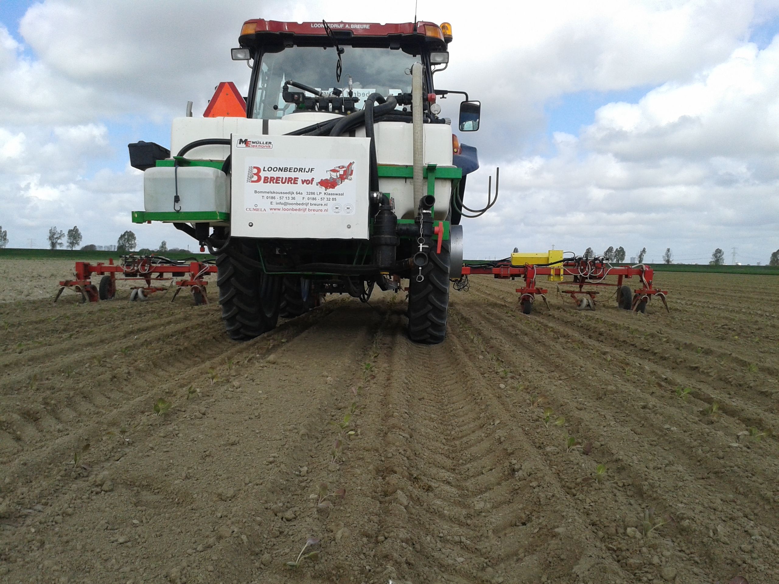 In Aardappelen, Spruiten en Mais heeft Loonbedrijf Breure de mogelijk een precisie bemesting uit te voeren met vloeibare kunstmest. De meststof wordt in de rij geinjecteerd na het poten of zaaien van uw gewas. De rijenbemester werkt 9 m breed en stuurt onafhankelijk elke 3 m werkbreedte. Grote voordeel van deze bemester is dat u tijdens het poten of zaaien geen omkijken hebt naar rijentoediening en daarna op het juiste tijdstip de rijenbemesting laat uitvoeren door Breure en kan profiteren van de voordelen. Informeer naar de mogelijkheden!!